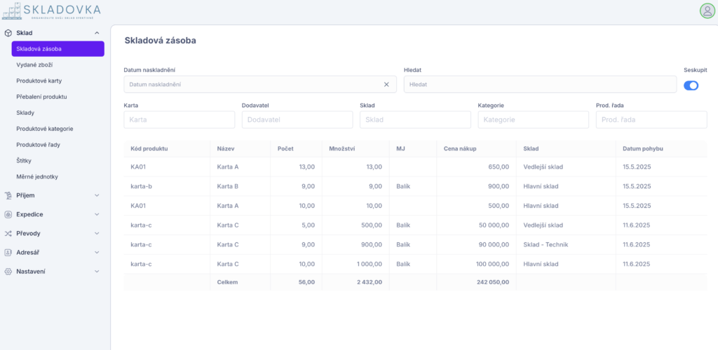 - skladové karty, pohyby, příjem/výdej a základní skladovou evidenci,